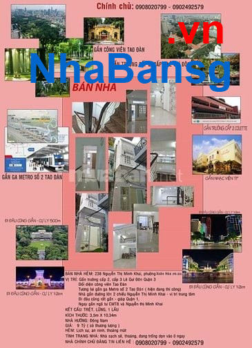 Gia đình cần bán nhà hẻm 238/12E Nguyễn Thị Minh Khai, Phường Xuân Hòa (Phường 6, Quận 3). Vị trí: gần trường cấp 2, cấp 3 Lê Quý Đôn Quận 3. Đối diện công viên Tao Đàn. Tương lai gần ga Metro số 2 Tao Đàn (hiện đang thi công). Nhà gần đường lớn 2 chiều Nguyễn Thị Minh Khai - vị trí trung tâm. Đi đâu cũng rất gần - giáp Quận 1. Ngay ngã tư CMT8 và NTMK Kết cấu: trệt, 1 lửng, 1 lầu Diện tích: 3,5x10,34m Nhà hướng Đông Nam Giá bán: 9 Tỷ (có thương lượng) Hẻm lịch sự, an ninh, thoáng mát Tình trạng nhà: sạch sẽ, thoáng, đang trống dọn vào ở ngay.